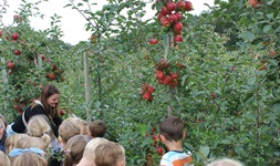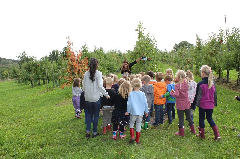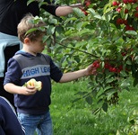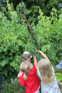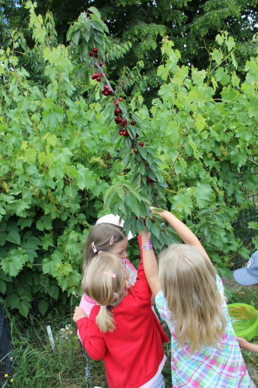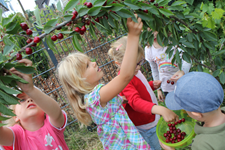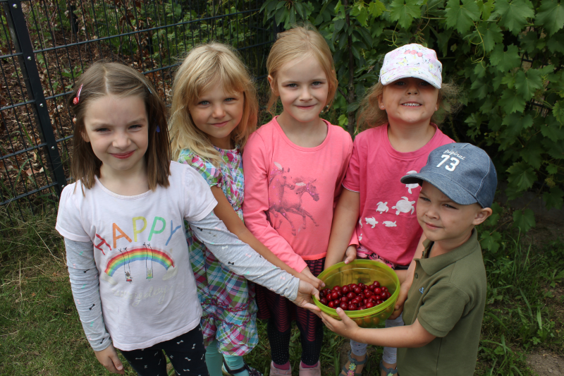 Kinder der Blumenwiese freuten sich über die erste Ernte im Kindergarten. Frau Bögel (Bauherrin) hat der Einrichtung den Kirschbaum zur Einweihung überreicht. Nun dürfen die Kinder jedes Jahr die leckeren Kirschen zum Frühstück genießen.