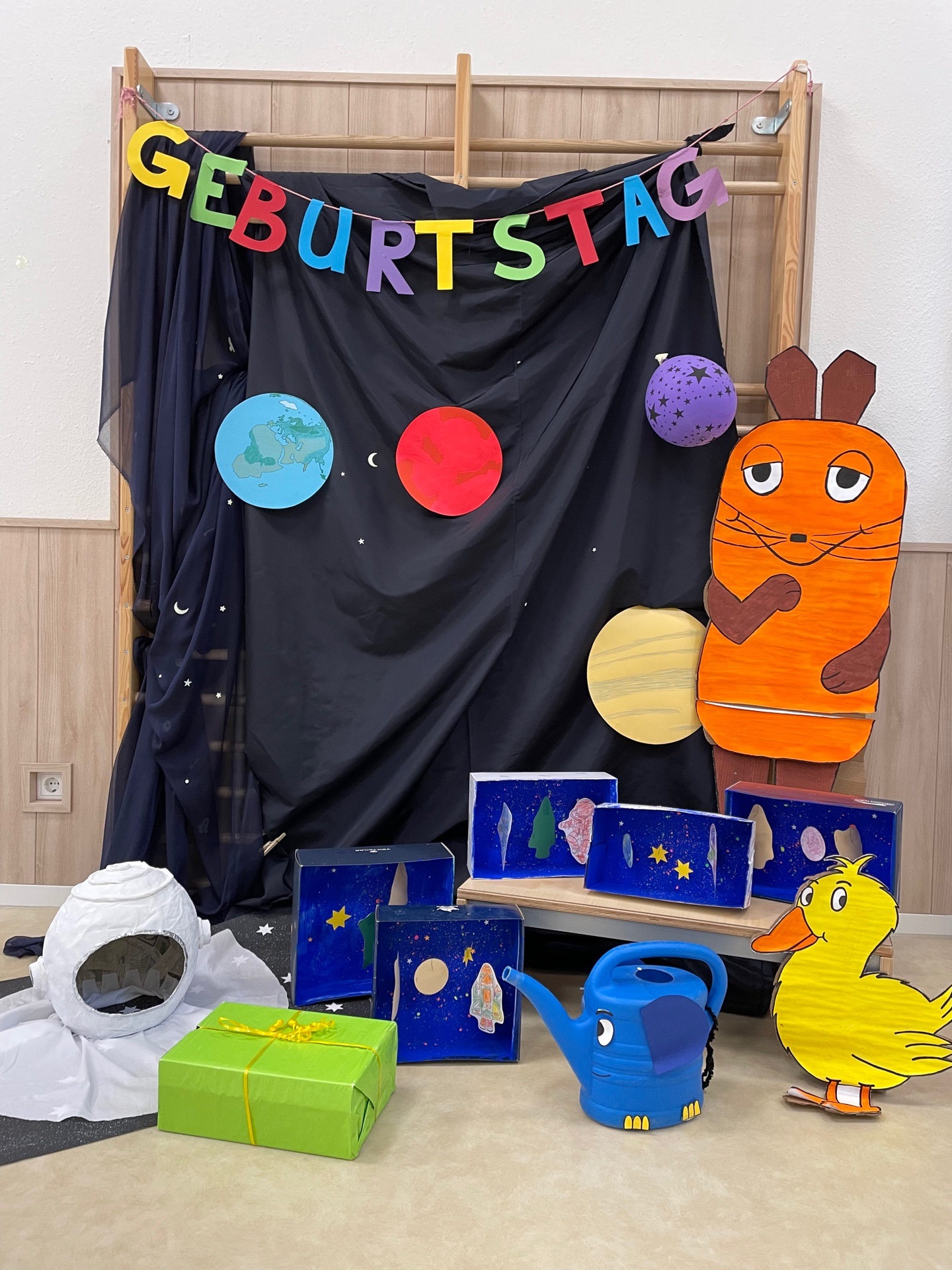 Das Familienzentrum Blumenwiese aus Laggenbeck feierten mit ihren Kindern den 50. Geburtstag. Das Motto war „UNSER UNIVERSUM“. Die Turnhalle wurde mit leuchtenden Planenten und Sternen geschmückt, um sich in dieser beeindruckenden Atmosphäre einen Film von der Maus im Weltall anzuschauen. In den folgenden Tagen wurden mehrere Themen aus dem Film aufgegriffen. Es wurden Experimente gemacht, mit Schuhkartons konnten die Kinder ein leichtendes Universum mit Planeten und Astronauten basteln. Außerdem wurden die Kinder der Blumenwiese Fit wie ein Astronaut und konnten einen Ausweis erwerben. Ein Foto als Astronaut im Universum zu machen, war für die Kinder etwas ganz Besonderes. Eine Geburtstagsfeier für die Maus durfte auch nicht zu kurz kommen. Es waren spannende und aufregende Tage für die Kinder, die viele neue Erkenntnisse und Erlebnisse gebracht haben.