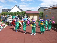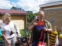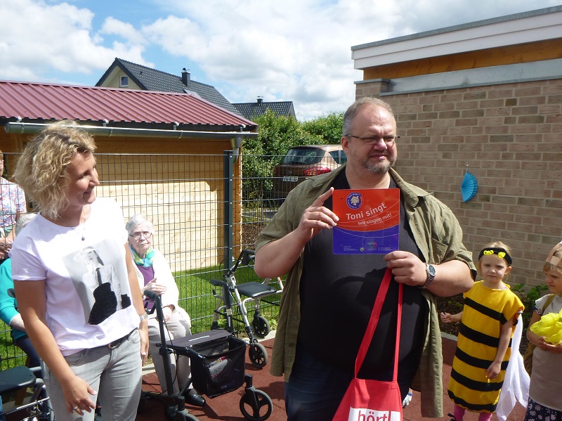 Zum Anfang des Sommerfestes fand noch ein besonderes Ereignis statt. Der Kindergarten Blumenwiese hat die Plakette „Toni singt“ von dem Bildungsreferenten Carsten Jaehner überreicht bekommen. Die Plakette wird unter der Voraussetzung erteilt, dass mehrere Kollegen die Fortbildungen zur Grundlage der Vokalpädagogik absolviert haben müssen.