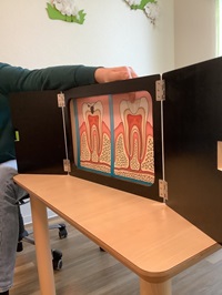 Im nächsten Treffen präsentieren wir den Kindern ein Kamishibai (Vorlesetheater) zum Thema „Milchzähne und Zahnlücken". Zudem setzten wir die Theorie in die Praxis um, wir putzen mit Hilfe der KAI-Regel (Kau-, Außen- und Innenflächen) unsere Zähne.