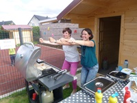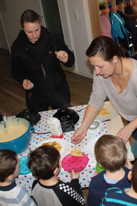 Jede Gruppe bekam ein Waffeleisen geschenkt, die direkt in Betrieb genommen wurden. Jeanette Ludewigt und Olivia Opiat (Fördervereinvorsitzende) brachten Teig mit und backten den ganzen Vormittag Waffeln für uns. Die Waffelbackaktion kam sehr gut an!